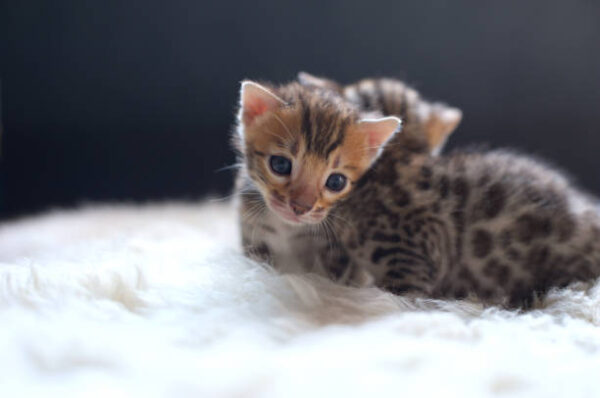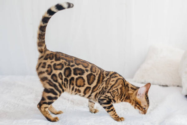 Bengal cats have a unique appearance as compared to other cat breeds. They have a glitter-like sheen fur coat that gives a smooth, silky feel. You will find them having spotted or marbled coat patterns that run all over the body. These coats consist of two colors mostly referred to as “rosette” like Jaguar. Adding to appearance, Bengal cats have symmetrical stripes that also run all over the body including heads, legs, and tails.
